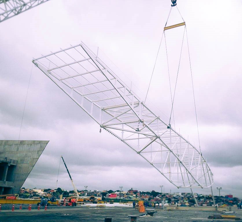 Structural project of the north and south mezzanines of the Corinthians Stadium. The project weighing 400 Tons and with an area of 1800m2 has a complex support typology and holds the north and south large scale screens.