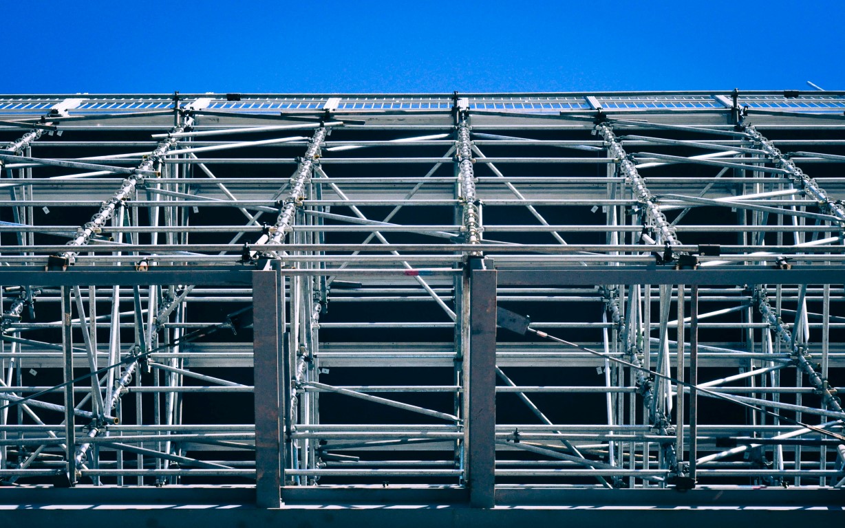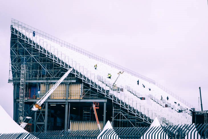 Structures for the support of temporary seats, being a mixture of wide-flange profile steel structures and scaffolding tubes to accommodate 20.000 people during the world cup.